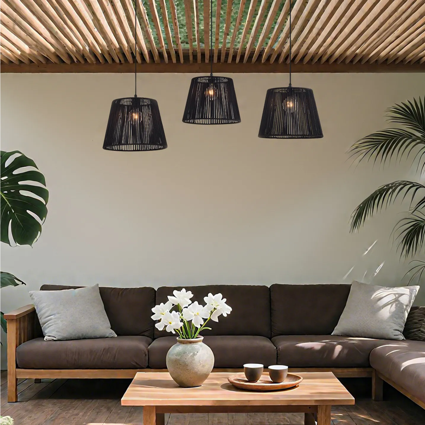 Zewnętrzna lampa wisząca czarna z plecionym abażurem, 3-punktowa IP44 – Cava Jayla